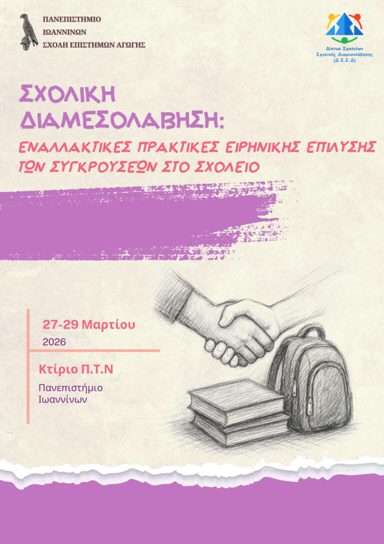 Tο Δίκτυο Σχολείων Σχολικής Διαμεσολάβησης του Εργαστηρίου Μελέτης Κοινωνικών Θεμάτων, ΜΜΕ και Εκπαίδευση (ΜΕΚΘΕΜΕ) διοργανώνει Πανελλήνιο Συνέδριο με τίτλο “Σχολική Διαμεσολάβηση: Εναλλακτικές Πρακτικές Ειρηνικής Επίλυσης των Συγκρούσεων στο σχολείο”, στις 27-29 Μαρτίου 2026, στο Παιδαγωγικό Τμήμα Νηπιαγωγών του Πανεπιστήμιο Ιωαννίνων.